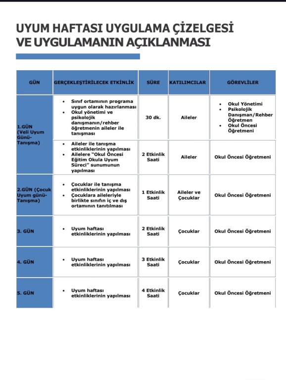 Anasınıflarımız ve 1.sınıflarımız için bakanlığımız tarafından yayınlanan uyum haftası programı aşağıdaki gibidir. Bilgilerinize sunarız.
